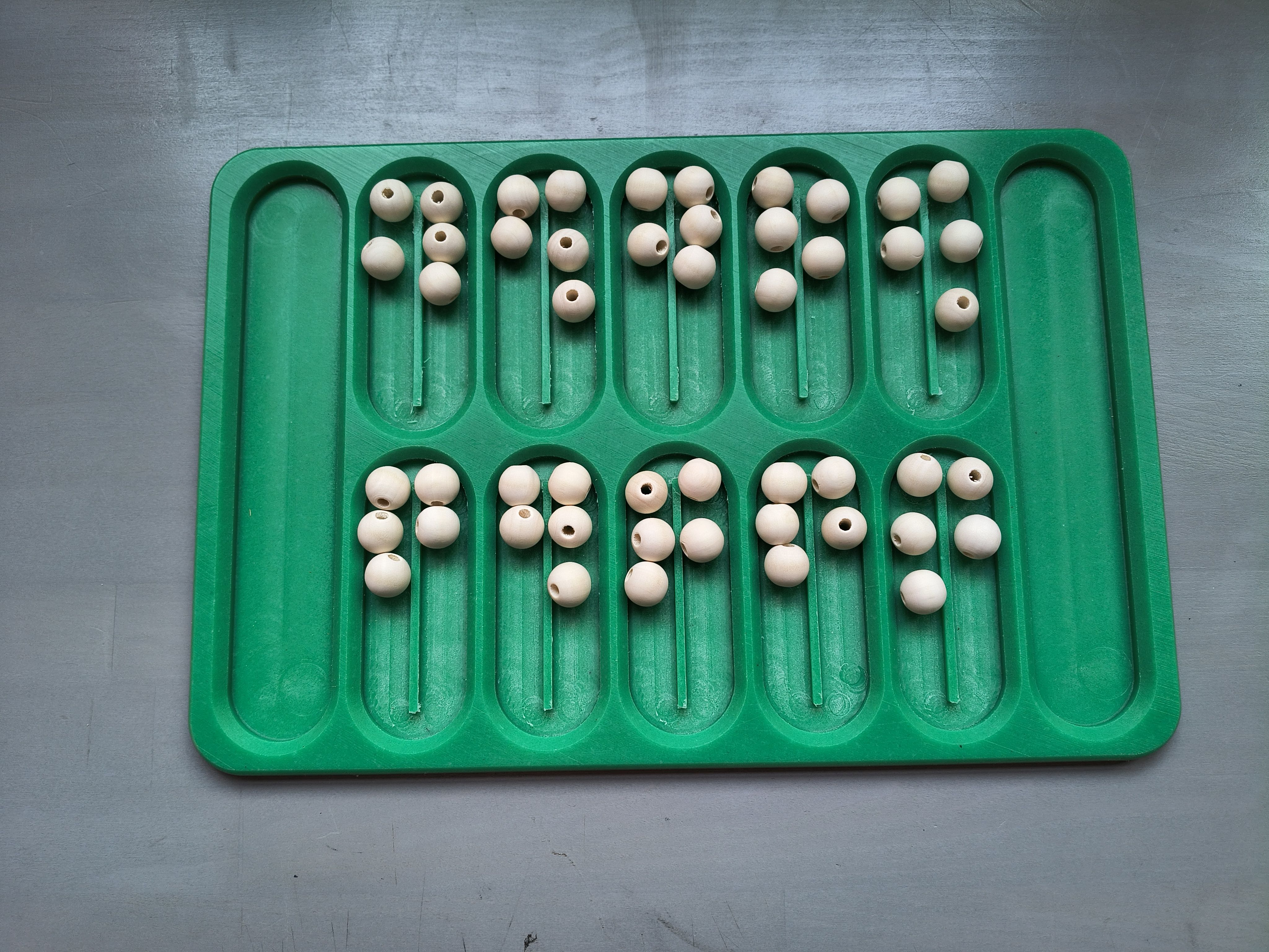 ![]() | Mankalová deska - domácí výroba | Deska pro hru Bao vyrobená z ozdobného PVC obložení určeného do kuchyně, s plochými korálky či fazolemi. Zakoupeno v Bauhausu na podzim 2019. |